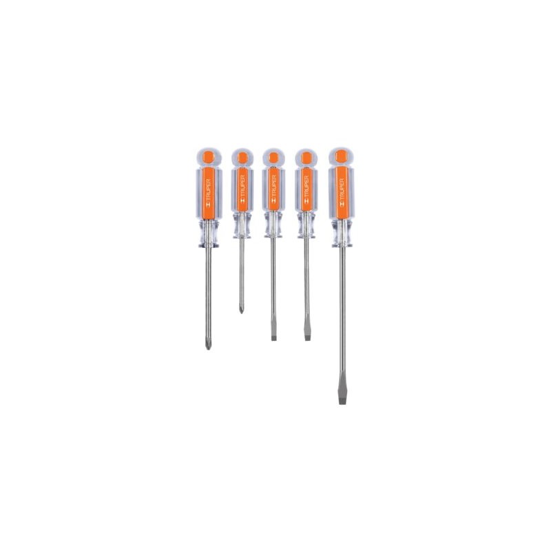 INCLUYE: 1 Desarmador punta plana (1/4? x 6?) 1 Desarmador punta plana (3/16? x 4?) 1 Desarmador punta de cruz (3/16? x 3?) 1 Desarmador punta de cruz (1/4? x 4?) 1 Desarmador punta cabinet (3/16? x 4?)